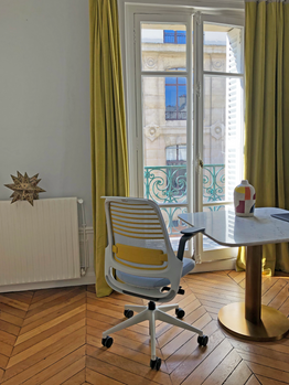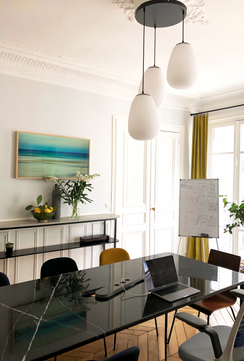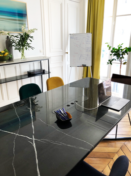 Un appartement haussmannien pouvant désormais accueillir une équipe de collaborateurs la journée sans dénaturer l’ambiance d’un appartement familial le soir et le week-end. Une table marbre sur-mesure qui se transforme en bureau collaboratif la journée. En arrière-plan, une console sur-mesure en pierre de Taza.